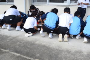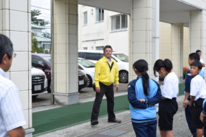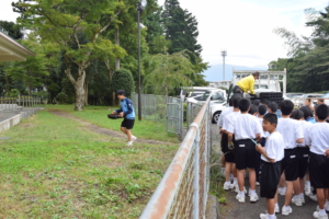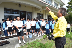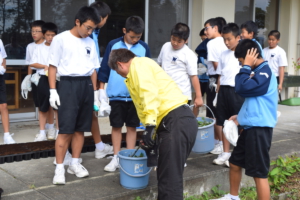 西中の生徒さんに作業を説明する 環境整備委員長 L黒崎一嘉