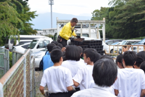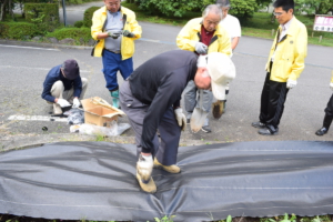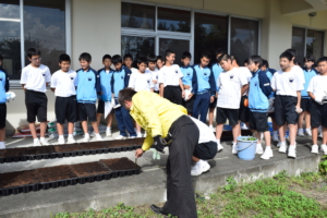 西中の生徒さんに植え込み方法を説明する 環境整備委員長 L黒崎一嘉