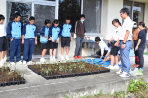 約千本の植え込みが終わり、散水する生徒さんたち