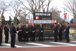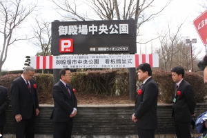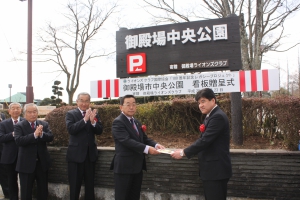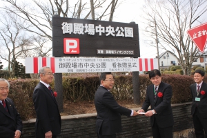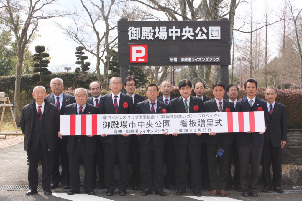 100周年レガシープロジェクト 2017年3月23日 於:御殿場中央公園 Posted on 2017年3月23日 ライオンズクラブ国際協会100周年レガシープロジェクトの一環として、御殿場ライオンズクラブでは、御殿場中央公園の入口看板を寄贈しました。 御殿場市を代表して 都市建設部長 小林龍也様、公園管理者を代表して 公園施設長 西山洋哉様に参加して頂き、贈呈式を行いました。 贈呈式 開始 司会 幹事 L.菅沼大介 贈呈の言葉 会長 L.小野田良夫 御殿場市 都市建設部長 小林 龍也様に目録を実物前で贈呈 参加者全員での記念写真