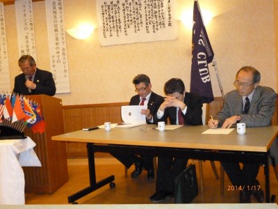 1285回 例会 於:名鉄菜館 2014年1月22日(水) Posted on 2014年2月14日 1.会長 L.鎌野茂樹 あいさつ 2.新入会員紹介 L.勝亦豊明 スポンサー L.勝亦政文 新入会員紹介 L.杉山啓二 スポンサー L.坪口榮二 新入会員紹介 L.土屋英司 スポンサー L.勝間田一博 誓いのことば 1月誕生ライオン 3.幹事報告 幹事:L.鈴木美男 4.中間決算報告 会計:L.土屋建城 P3~P6ですが紙面の関係上未掲載です 5.テールツイスター L.野村弘徳 テールツイスターよりの誕生祝 6.新会員・スポンサーとの懇談会 GM・GLT委員長 L.勝間田一博 新会員・スポンサーとの懇談会の様子 7.ライオンズローア L.高橋成彰