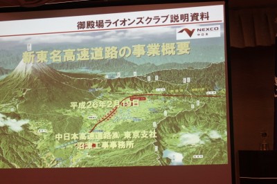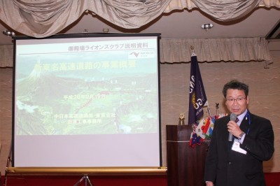 第1287回 例会 於:名鉄菜館 2014年2月19日(水) Posted on 2014年2月19日 *会長 L.鎌野茂樹 あいさつ *指名委員長 L.土屋廣実 2014.7.~2015.6 次期役員候補者について 別紙3P参照 *幹事報告 幹事:L.鈴木美男 *ゲストスピーチ 中日本高速道路㈱東京支社 沼津工事事務所 副所長 高橋幸三様(中央) 工務課長 長谷俊彦様(右) 御殿場市役所 新東名課 課長 勝俣 昇様(左) *演題 「新東名の事業の様子と今後の予定」 *新東名高速道路の概要 *講演の様子 *長谷俊彦様の御殿場ICの周辺の様子の講演 *委員会報告 計画(姉妹提携)委員会 委員長 L.駿東友次郎 小松LC CN55周年式典参加について *囲碁・麻雀クラブ L.塩川講吉 第2回マージャン部大会の報告 *出席率の報告 出席情報委員会 委員長 L.矢後芳博 78.9% *ライオンズローア L.小野盛久