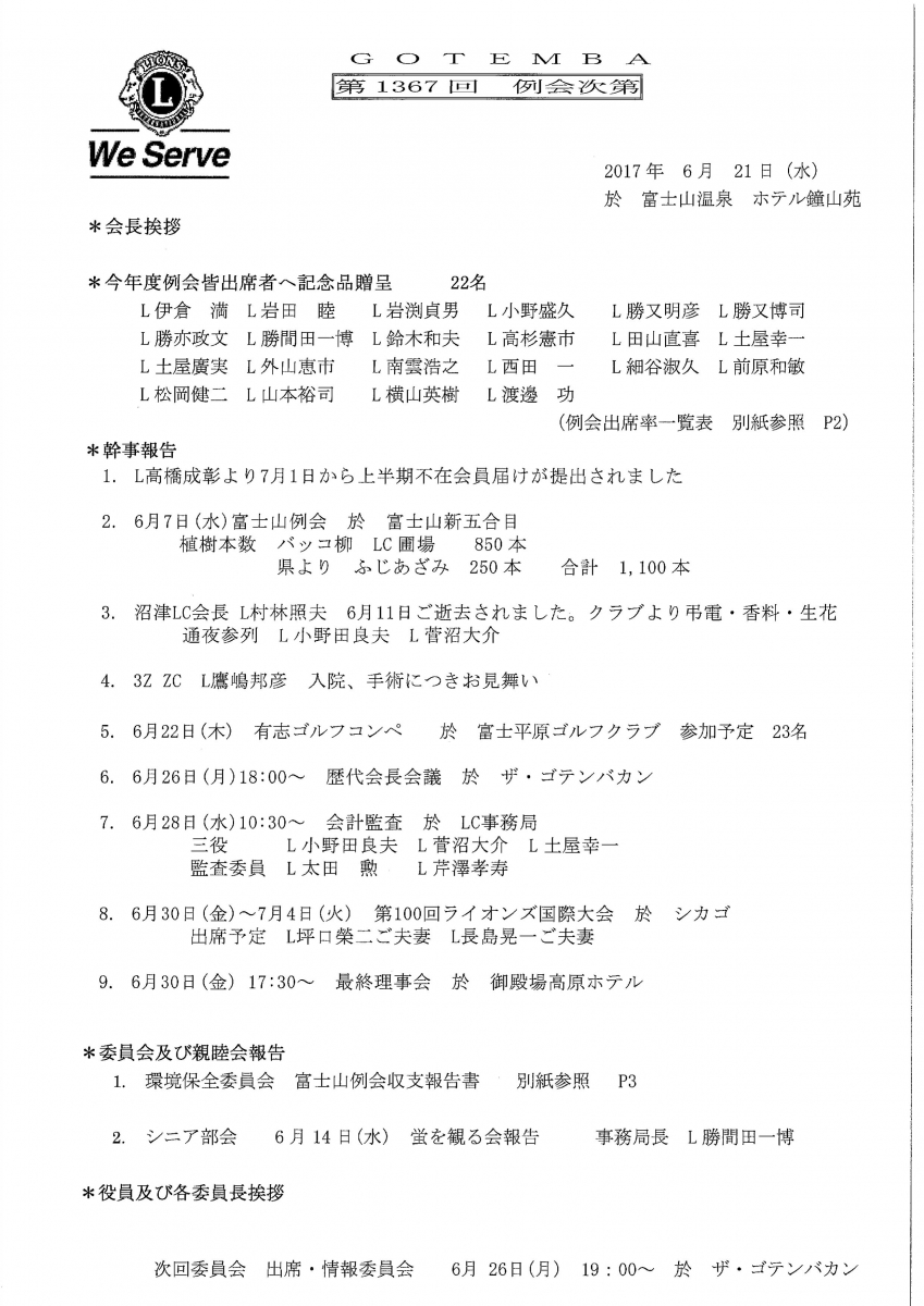 第1368回 例会 2017年7月5日 於:名鉄菜館