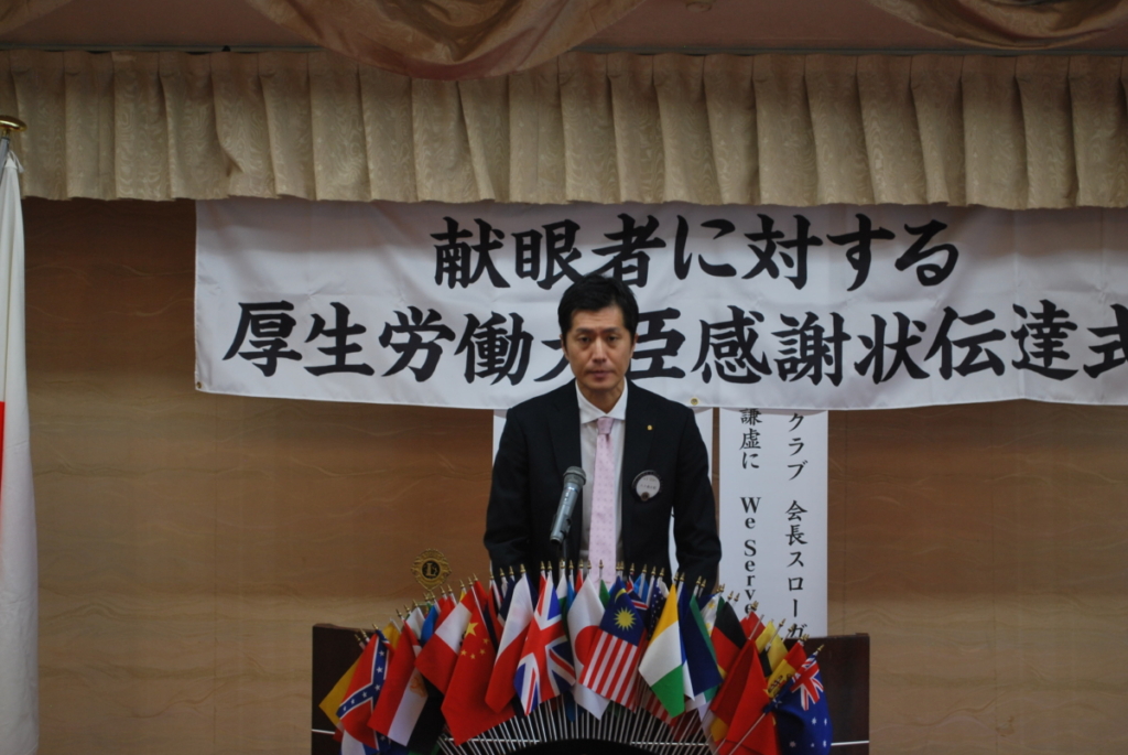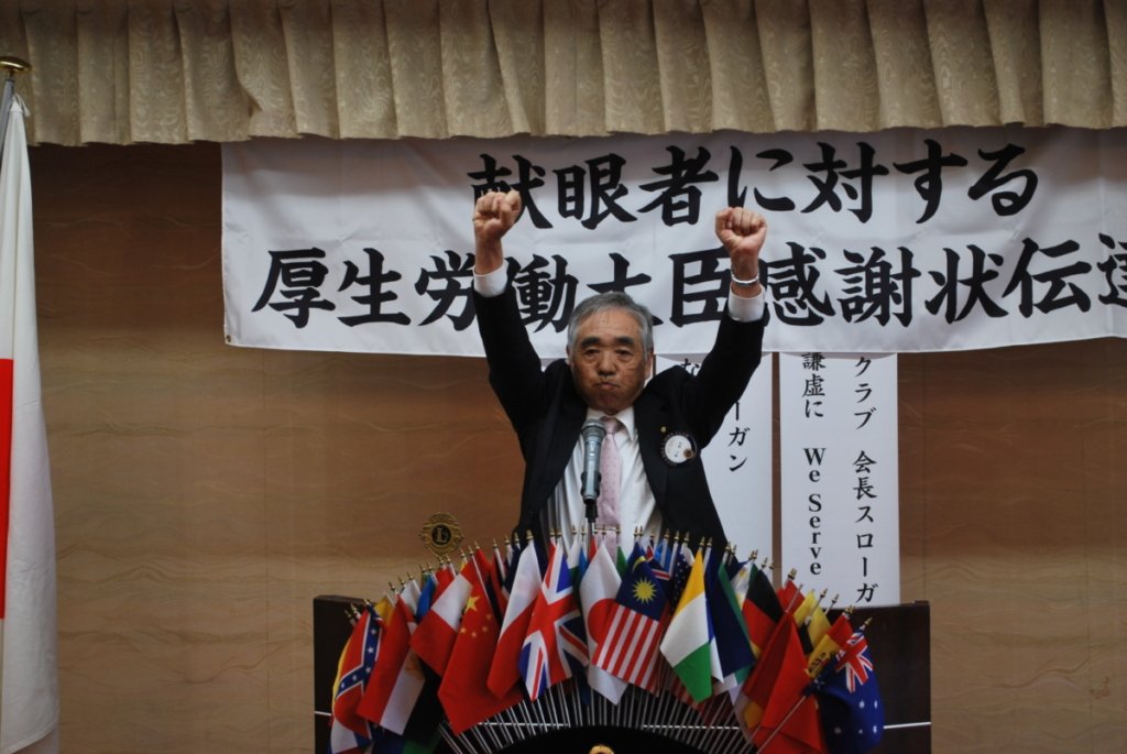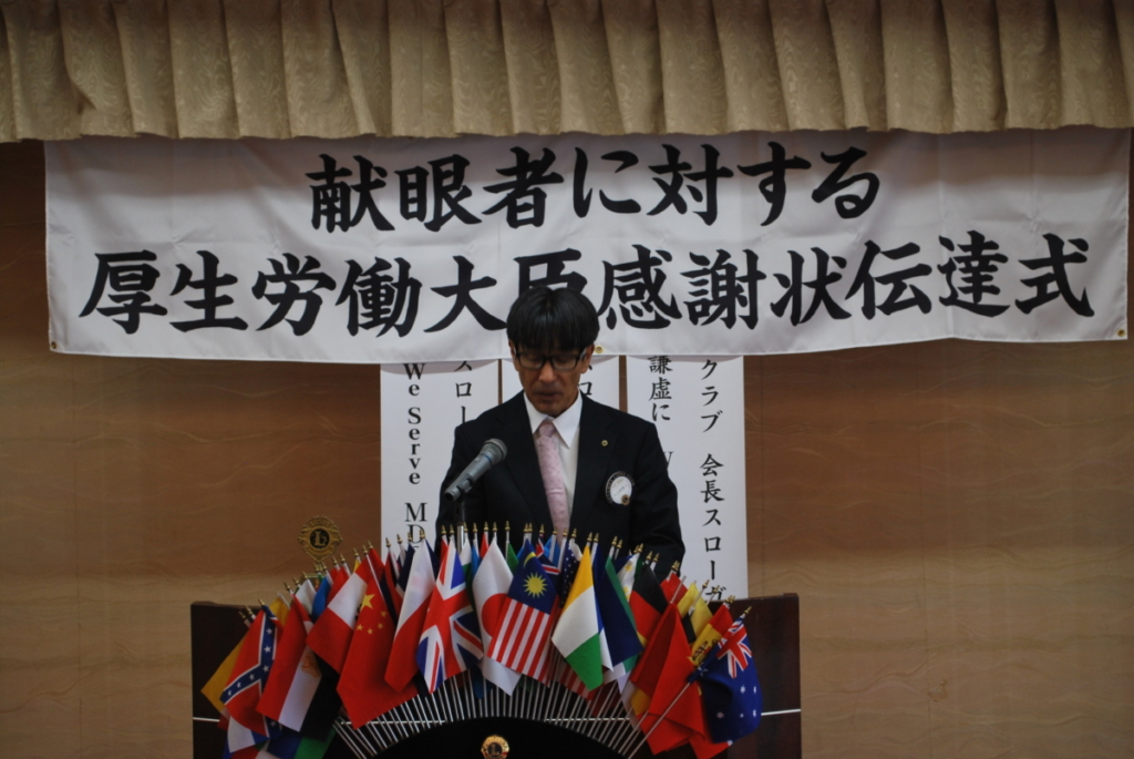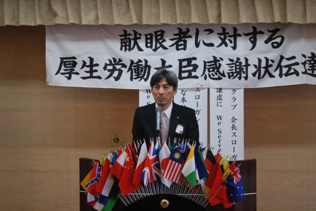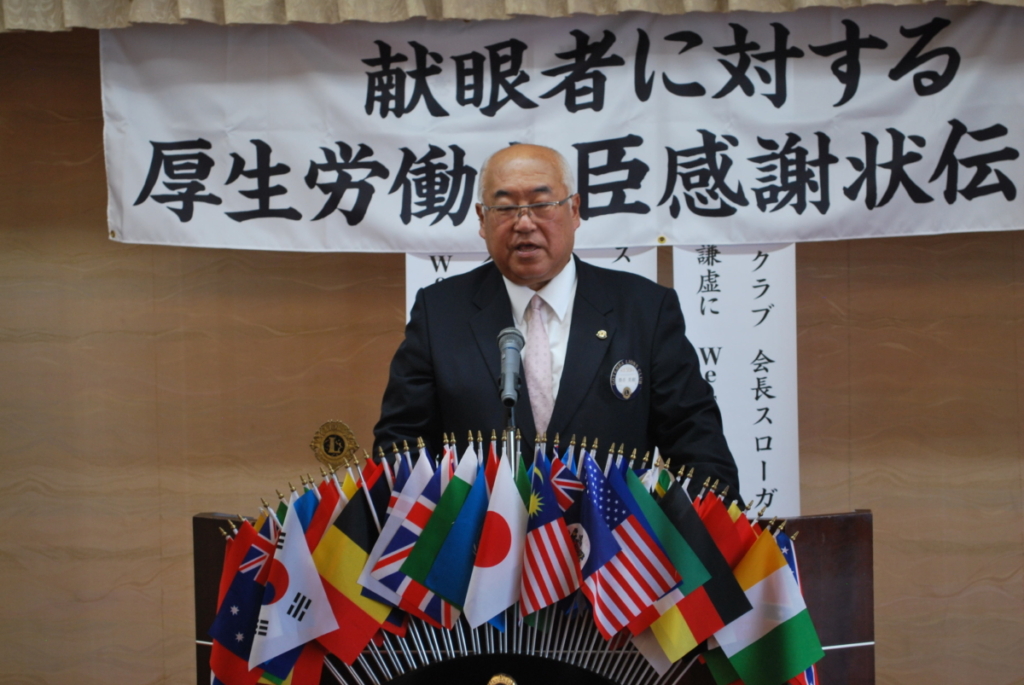 第1567回10月第二例会 Posted on 2025年10月16日 10月15日(水)名鉄菜館に於いて10月第二例会「献眼者に対する厚生労働大臣よりの感謝状伝達式」が開催されました。 献眼者ご遺族の方々 尊いご奉仕を賜りありがとうございました L.勝亦英樹会長挨拶 ご遺族の方々に感謝状伝達 ご遺族代表勝間田賢一様挨拶 L.土屋雅人幹事報告 YCE.社会福祉委員長L.八十島正起委員会報告 姉妹提携副部会長L.立道浩幸報告 三献委員会理事L.勝又親男ローア