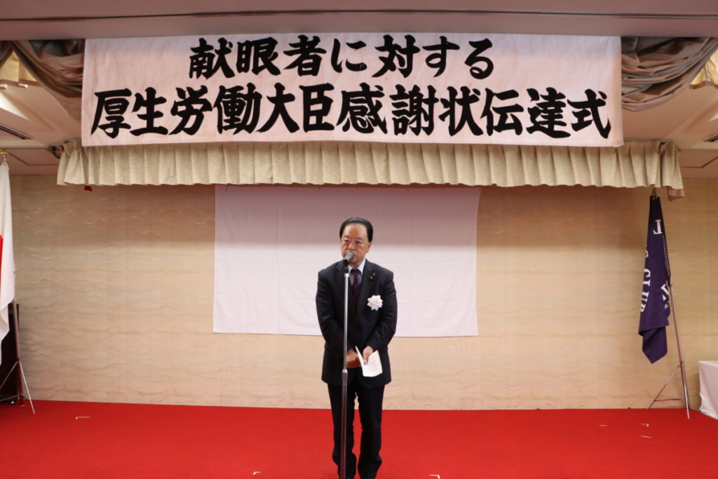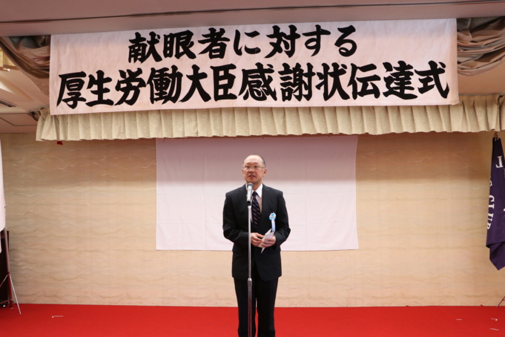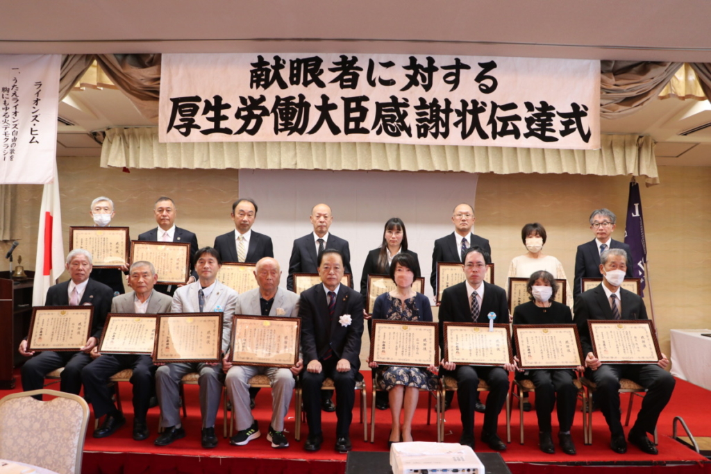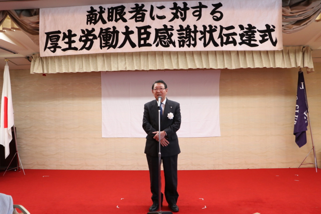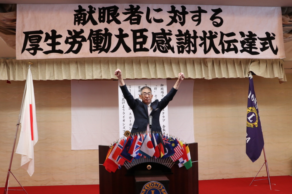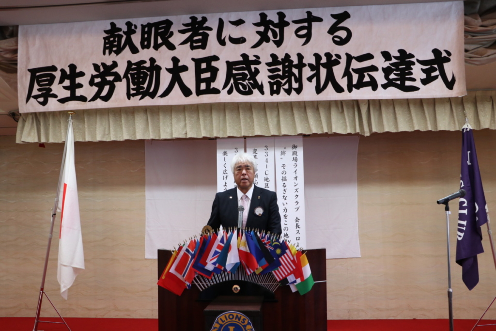 第1519回 献眼者に対する厚生労働大臣よりの感謝状伝達式 Posted on 2023年11月21日 10月18日(水) 名鉄菜館において 第1519回特別例会、 「献眼者に対する厚生労働大臣よりの感謝状伝達式」が開催されました。 会長挨拶 L.鎌野純一 御殿場市長 挨拶 勝又 正美 様 公益財団法人静岡県アイバンク常務理事 挨拶 渡邊 康一 様 ご遺族の皆様 ご遺族代表 挨拶 ローア L.永井 誠一